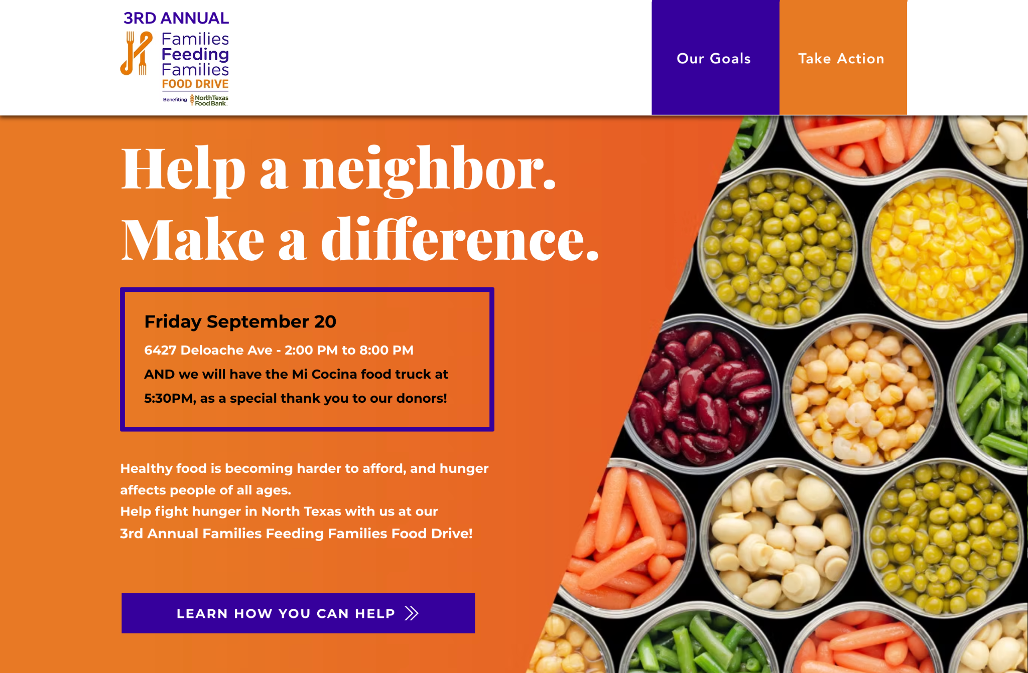 Families Feeding Families is an annual fall food drive in Dallas, dedicated to providing meals and support to families facing food insecurity during the holiday season. This event required a single-page website highlighting important event details, donation information, and links to 3rd-party fundraising and volunteer pages.