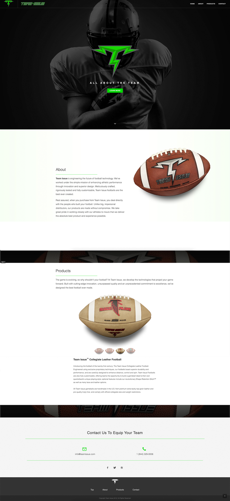 A custom football maker rebranded their business to Team Issue (like standard-issue), and needed a one-page website showcasing their mission, products, and contact information.