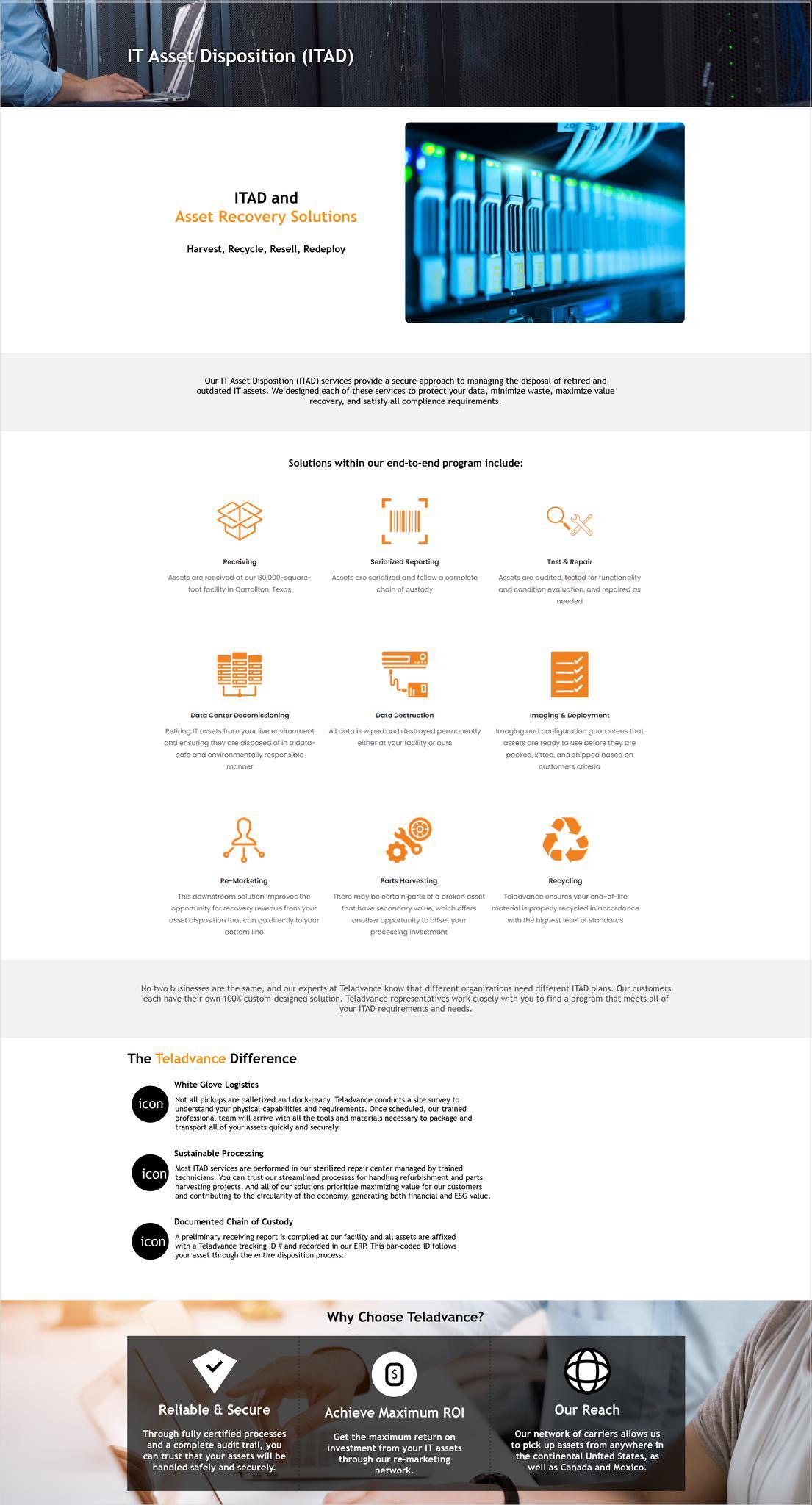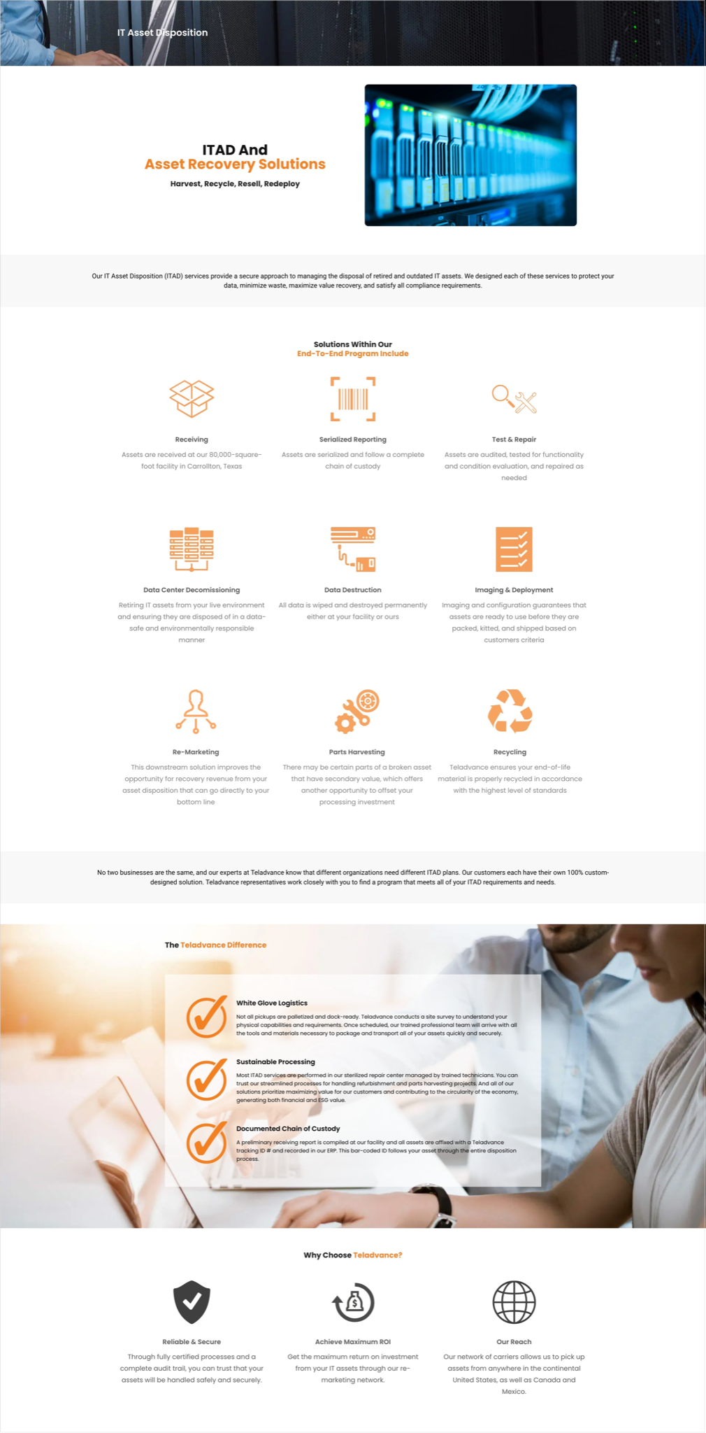 Internal restructuring and the addition of a new ITAD services department led to a need for a full website redesign and optimization, in order to present Teladvance's new mission and services in a clear, modern design.