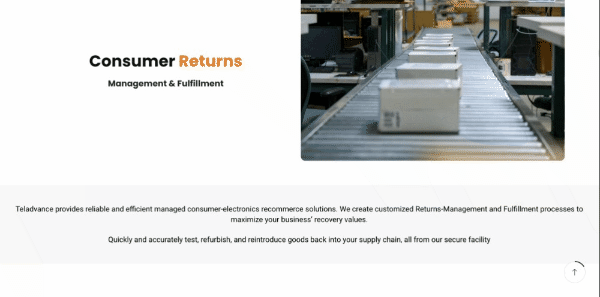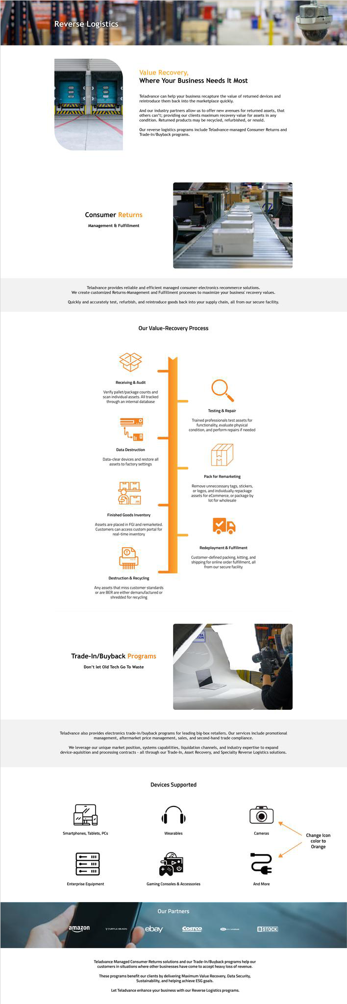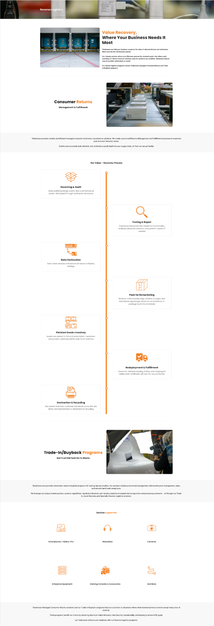 - Combined closely-related services like Consumer Returns and Trade-In Programs onto a single page to keep the Solutions menu more organized and to avoid repetition of "Value Recovery" messaging.