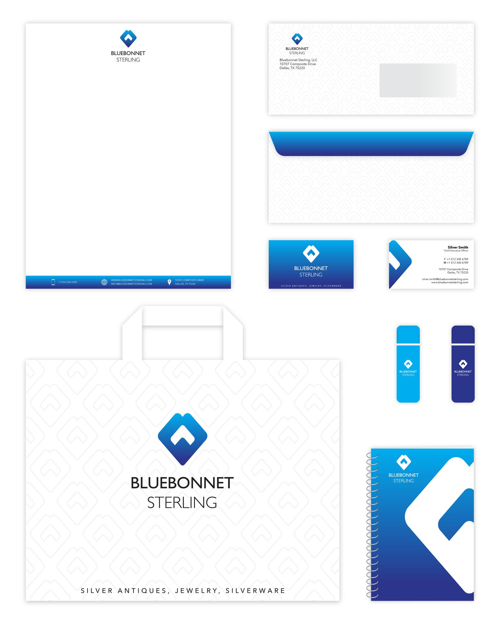This is a branding kit I designed for Bluebonnet Sterling. The kit includes designs for letterhead, envelopes, business cards, USB drives, retail bag, and notepad.