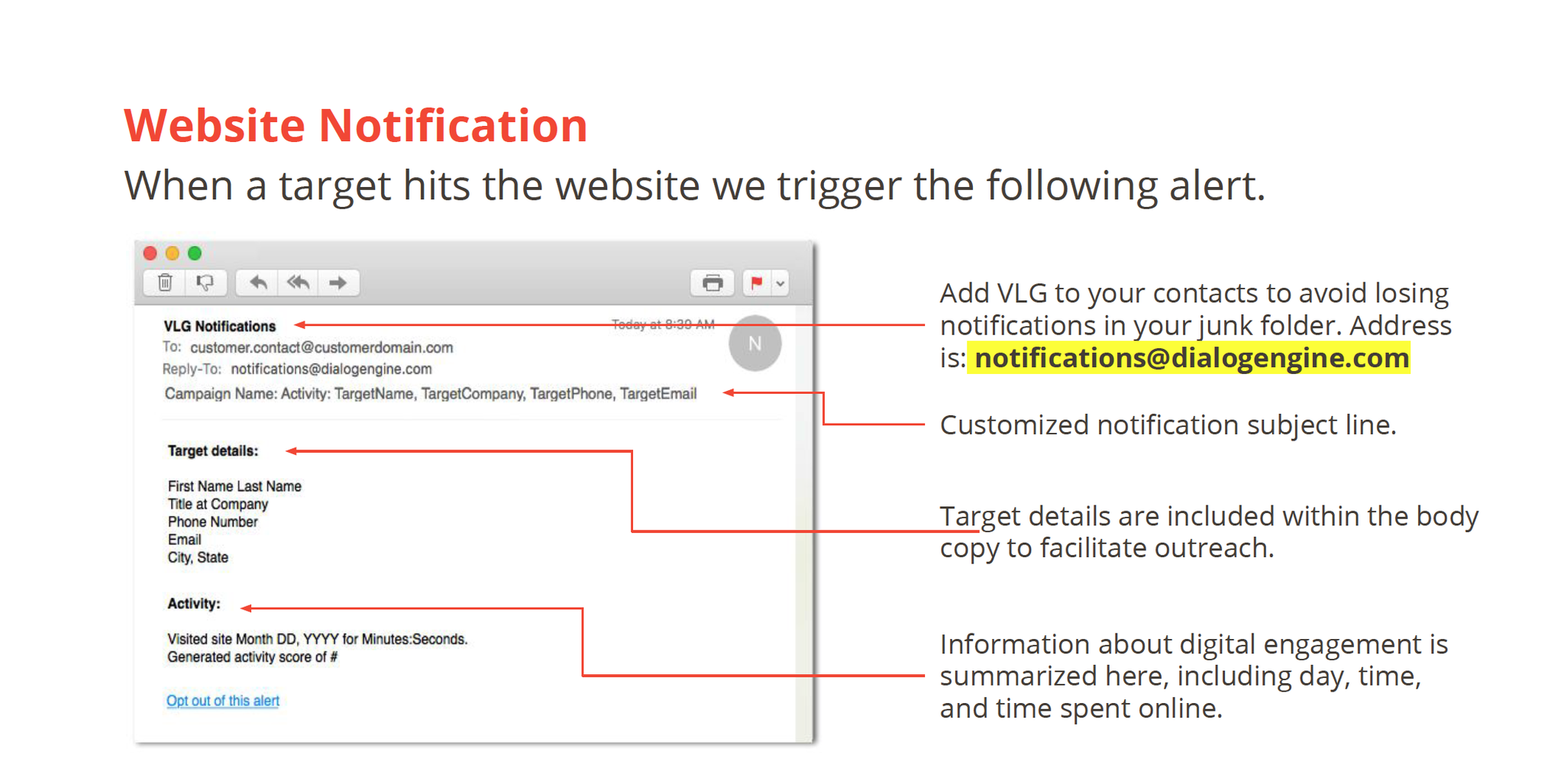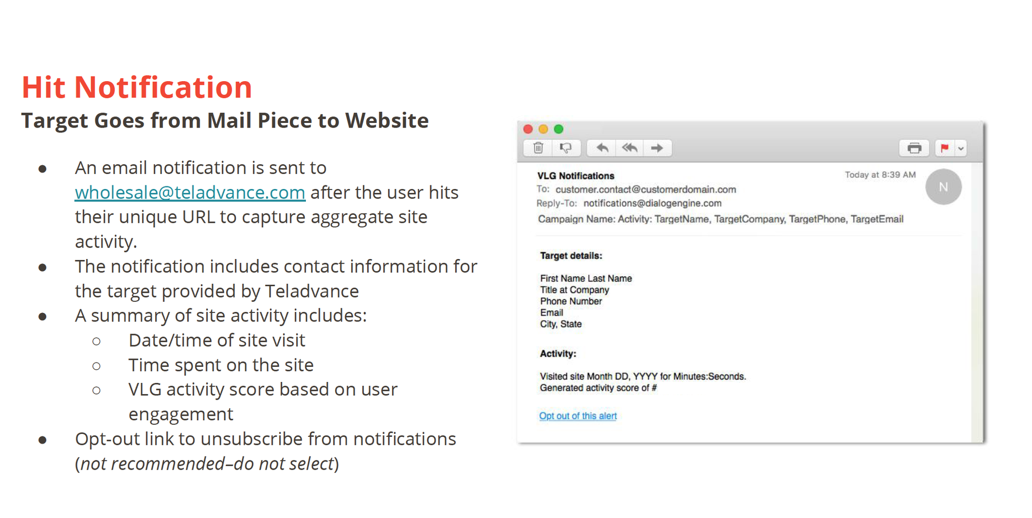 A custom URL was created for each recipient and printed on material in the package. When a recipient used the URL, I received a notification of the lead.